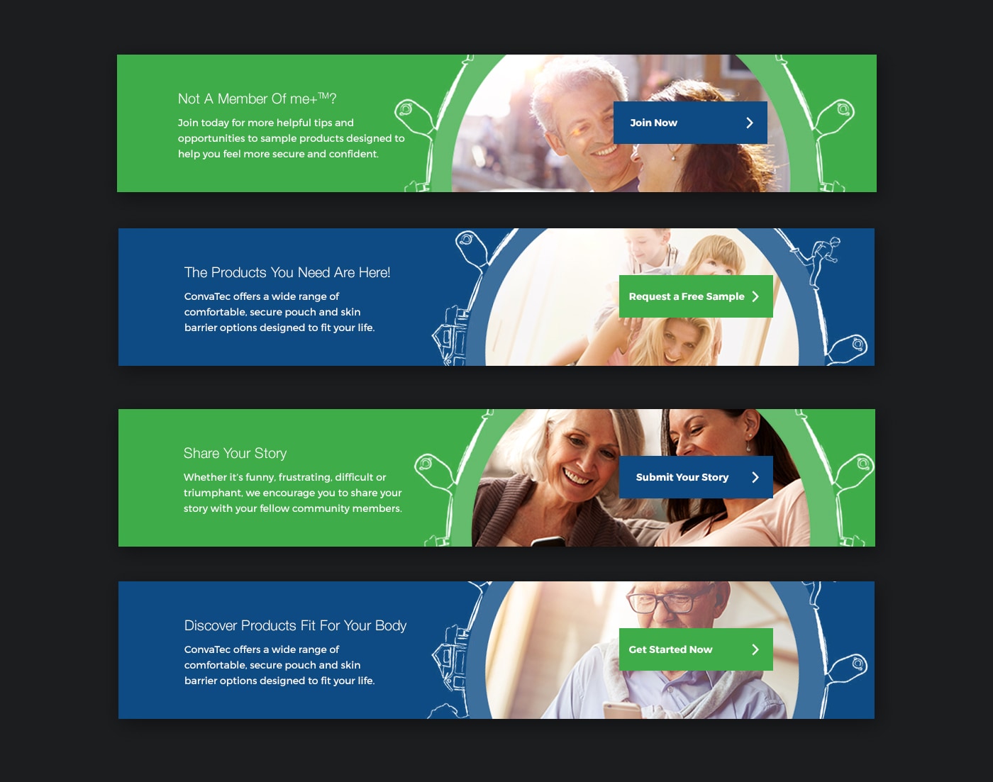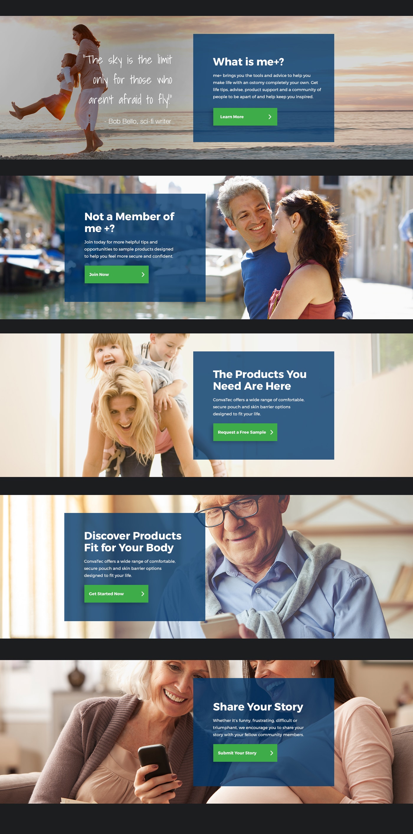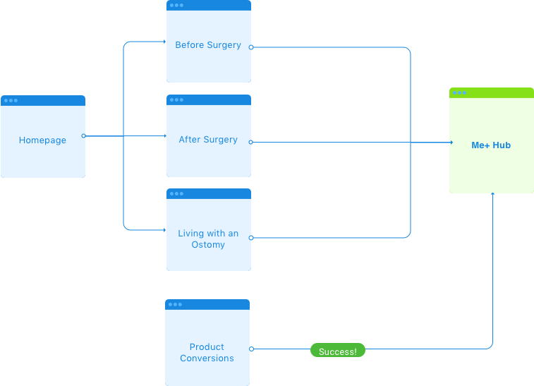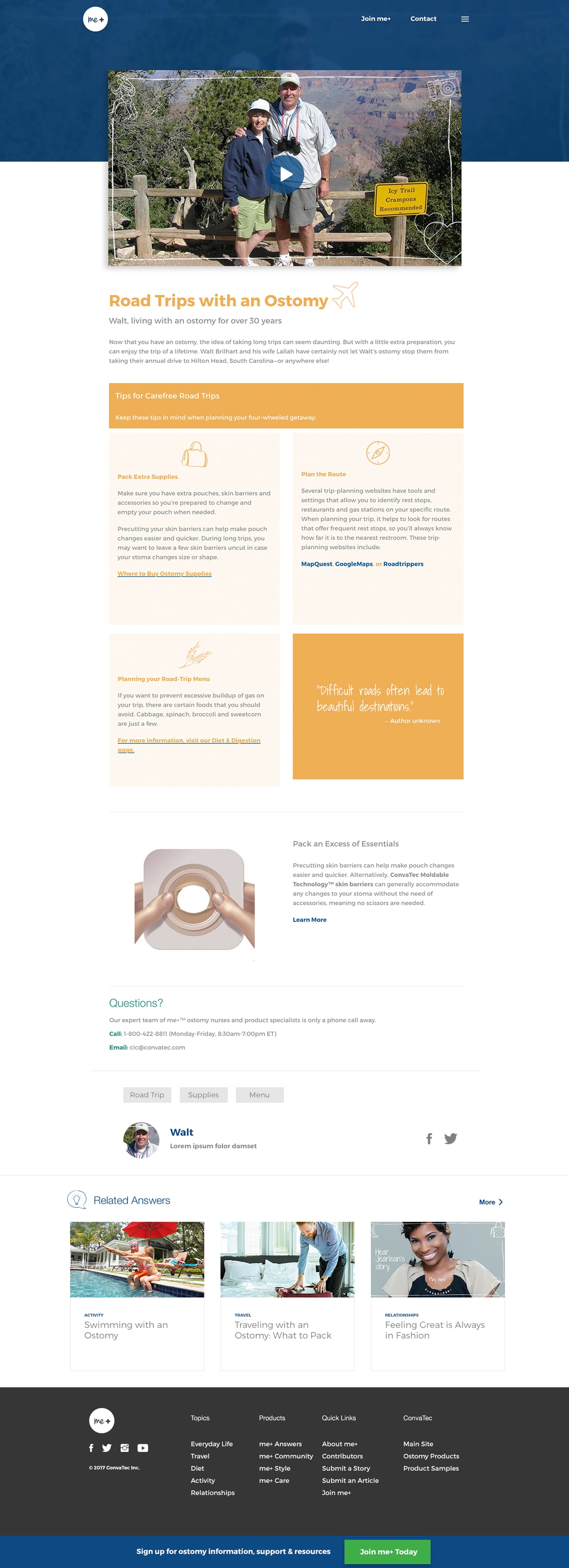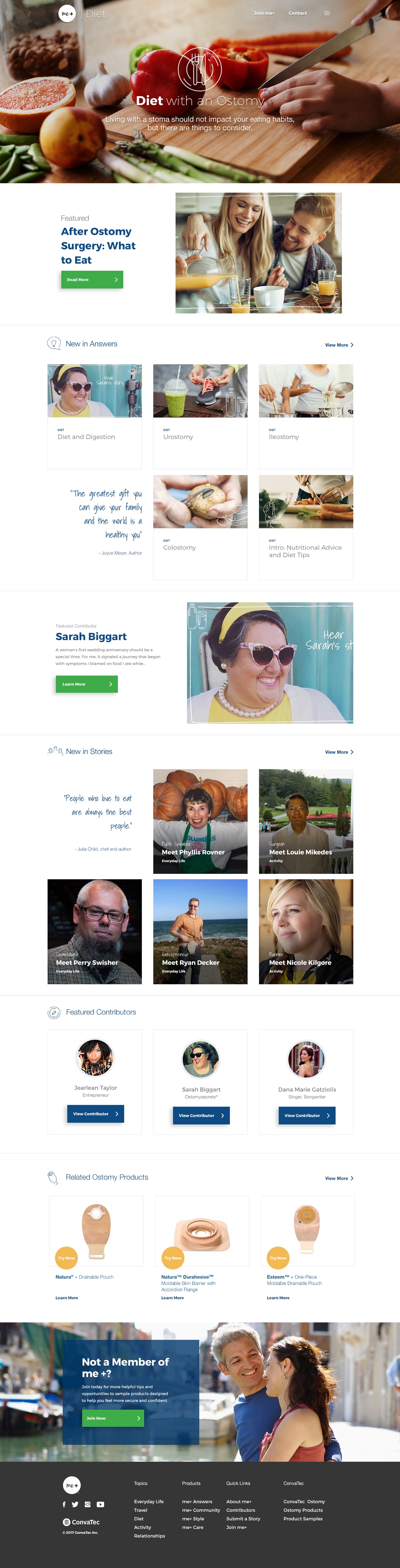 The ostomy me+ program’s web presence was in need of reevaluation. There was a lot of content users could engage with, but it was located in different places across the site. The majority of valuable content was mixed in with corporate content, general ostomy information, and product / sales content. Overall, the pages needed to highlight the value of the program.